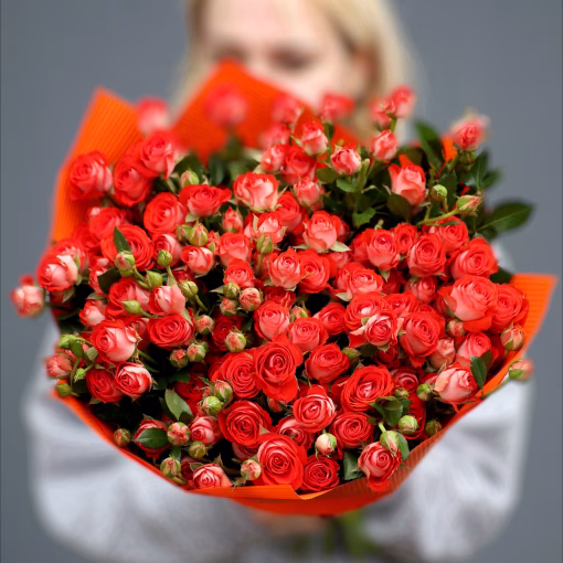 Bouquet of 19 shrub roses in a stylish package. A complimentary flower card and a pack of cut flower food are included with each bouquet. The recommended number of flower life extension sachets is 5 pieces.