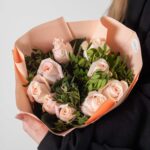 A bouquet of 9 pink Ecuadorian roses complemented with decorative greenery. A clean and versatile arrangement, suitable for everyday gifting or interior decoration.