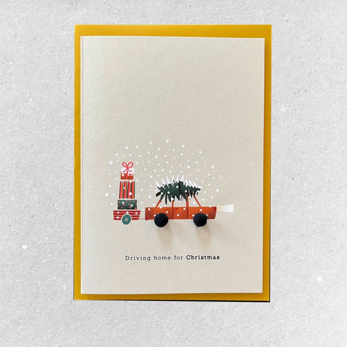 An elegant 3D card with the text “Driving home for Christmas”. The raised details create a festive dimensional effect.