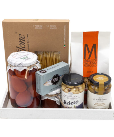 Includes: Georgian Satsebeli sauce 330 g Espinaler cod liver “Folie del Mar” REIETÓ pitted Gordal olives 370 g Pepus sardines Pepus white tuna in vegetable oil Mancini Pasta Mista 500 g Casa Marrazzo San Marzano DOP tomatoes 420 g La Campofilone Maccheroncini IGP pasta 250 g