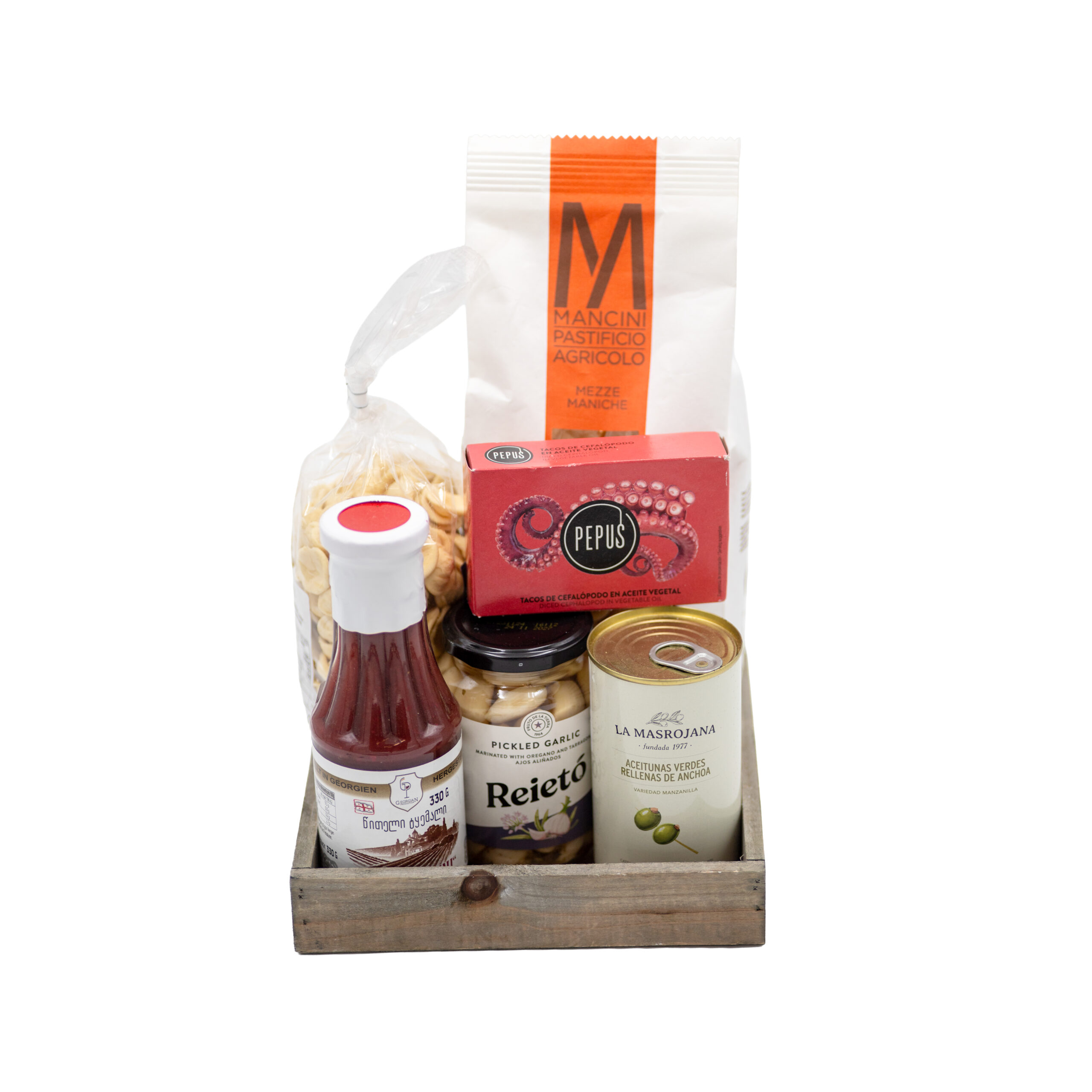 Includes Mancini Mezze Maniche pasta 500 g Georgian red Tkemali sauce 330 g Pepus octopus 115 g Reietó marinated garlic cloves La Masrojana green olives stuffed with anchovies 150 g Terre Dei Trulli Orecchiette pasta 500 g