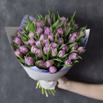Bouquet of 49 tulips “Double Price” in a stylish package. To each bouquet we enclose a free card and a product that prolongs the life of flowers.