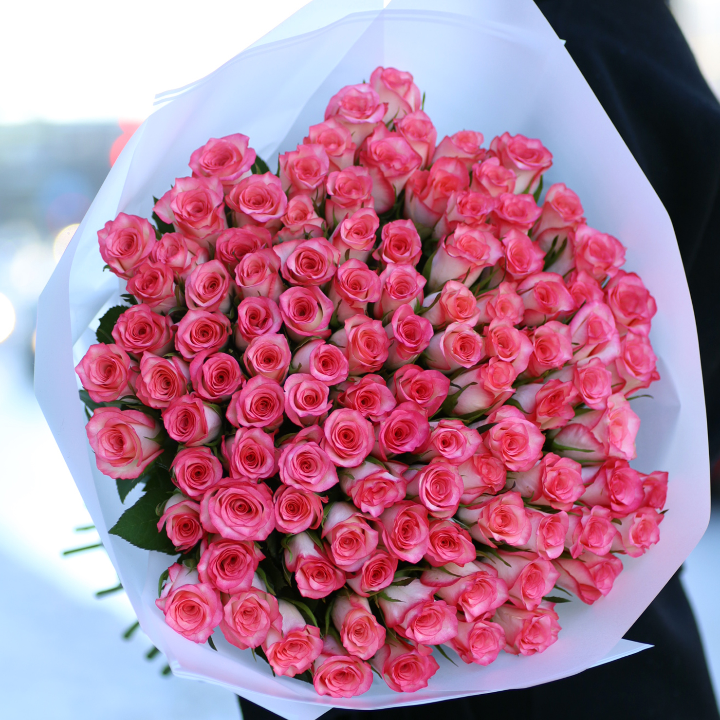 Chic bouquet of 101 red roses, 35-50 cm tall, in a stylish wrap(Kenya). A complimentary flower card and a pack of cut flower food are included with each bouquet.