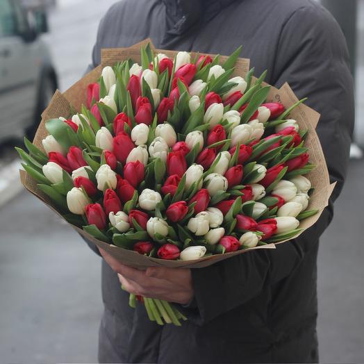 Bouquet of 101 white and red tulips in a stylish package. A complimentary flower card and a pack of cut flower food are included with each bouquet.