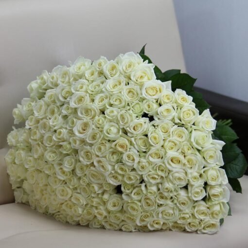 Chic & classic bouquet of 201 white roses, 50 cm tall. We include a complimentary flower card and a pack of a rose life-extending product with each bouquet.