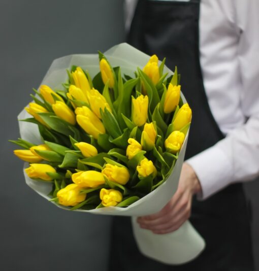 Bouquet of 25 yellow tulips in a stylish package. A complimentary flower card and a pack of cut flower food are included with each bouquet.