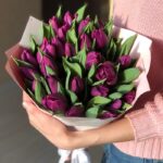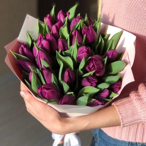 Bouquet of 25 purple tulips in a stylish package. A complimentary flower card and a pack of cut flower food are included with each bouquet.