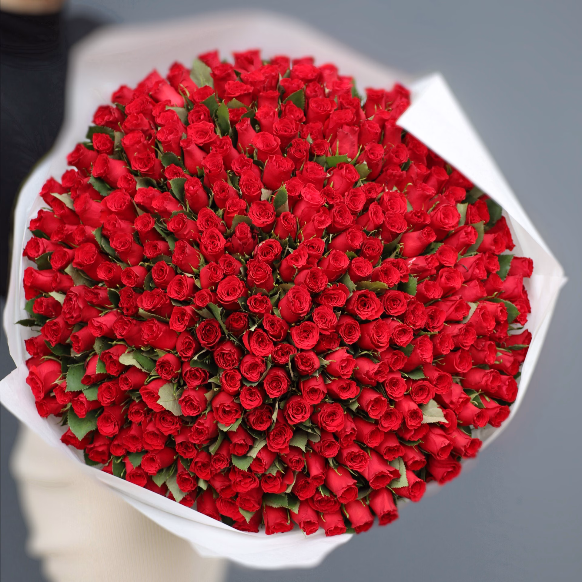 Chic bouquet of 301 red roses(Kenyan), 50 cm tall, in a stylish wrap. A complimentary flower card and a pack of cut flower food are included with each bouquet.