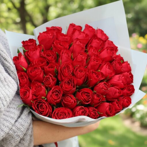Classic bouquet of 51 fresh red roses (Kenya), height 30 cm.