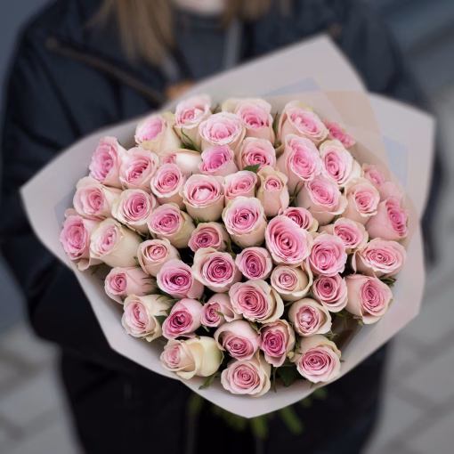 Chic bouquet of 51 roses, 35-50 cm tall, in a stylish wrap. A complimentary flower card and a pack of cut flower food are included with each bouquet.