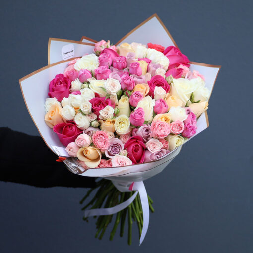 A ‘mixed’ bouquet is assembled with flowers of various colours and varieties, as available at the time of the order. The photo is for illustration purposes only.