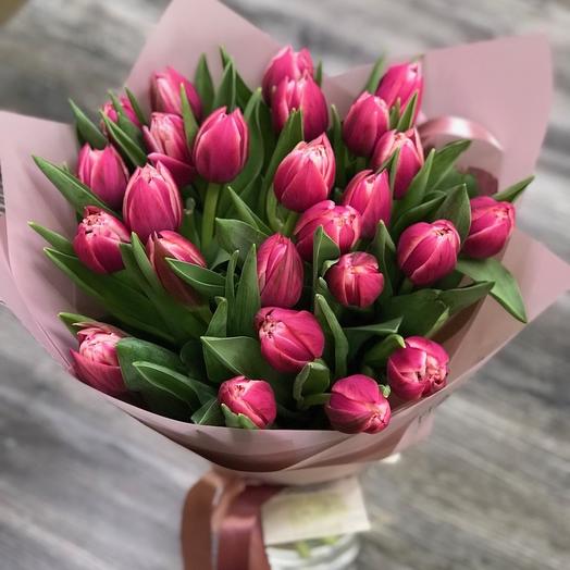 Bouquet of 25 peony tulips “Columbus”. A complimentary flower card and a pack of cut flower food are included with each bouquet.