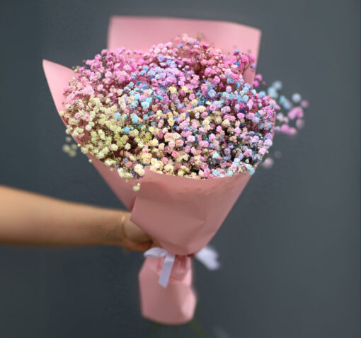 A bouquet of rainbow-colored gypsophila in a stylish wrapping. It will bring you joy for a very long time. We attach a card and a flower life extension product to each bouquet for free.