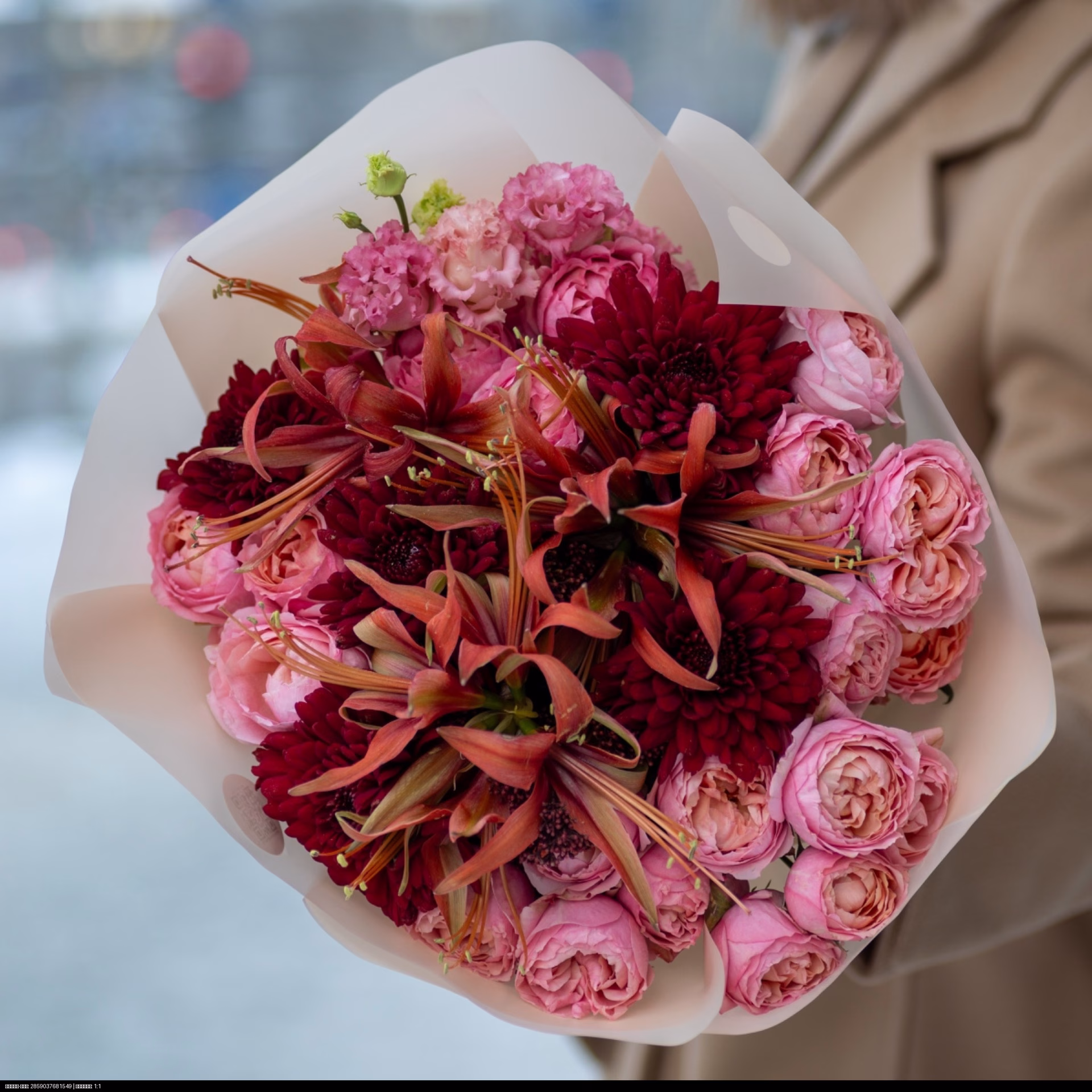 A bouquet featuring peony-style chrysanthemum, Juliet rose, hippeastrum, and skimmia — a stylish choice for gifts and special occasions.
