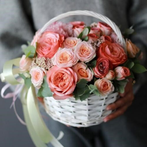 Soft & tender basket of various rose cultivars and eucalyptus.
