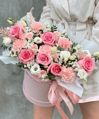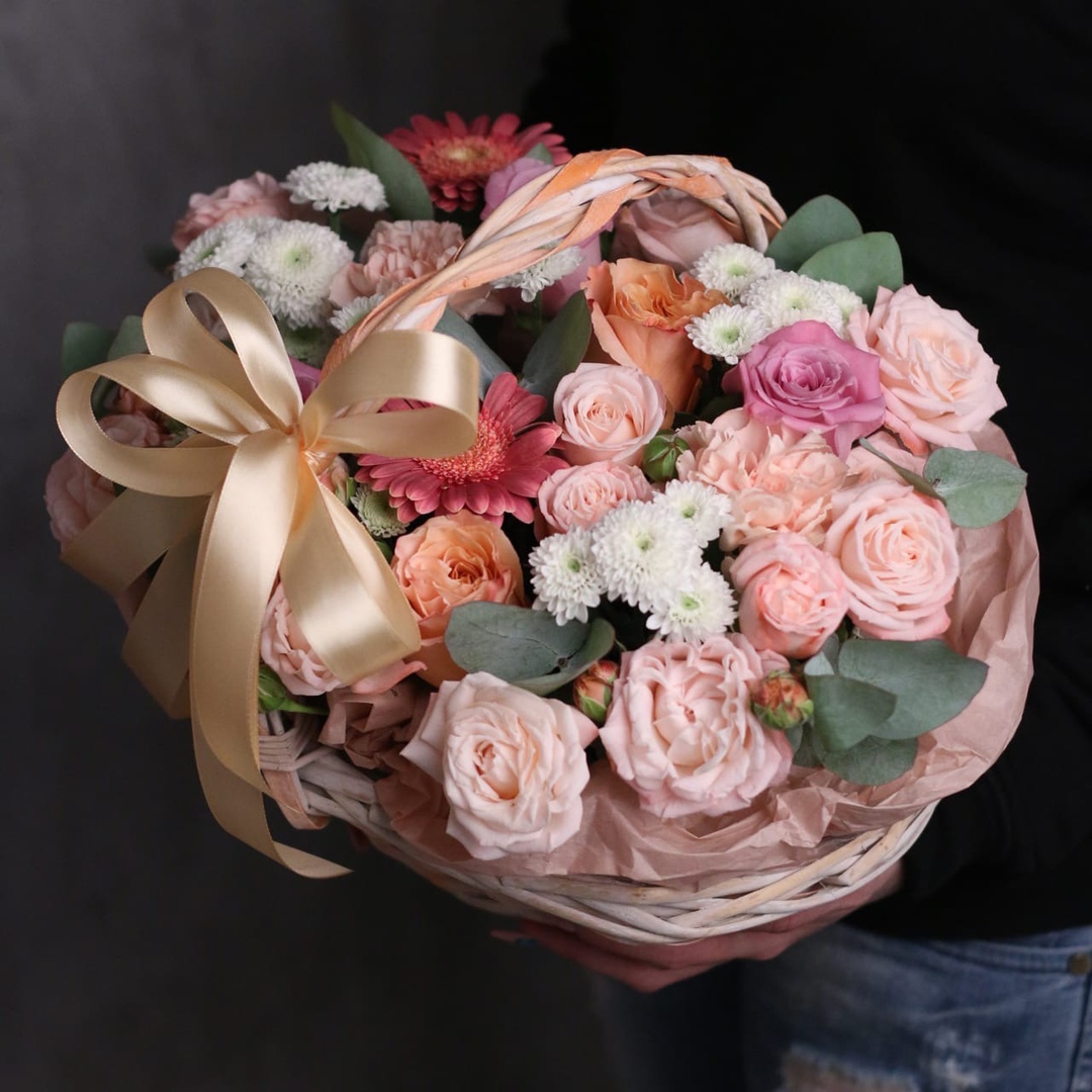 A soft & tender basket of fresh flowers. Composition: gerberas, Santini chrysanthemums, various rose cultivars, shrub peony roses. The colour scheme is variable.