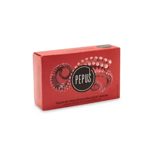 Humbolt octopus, rich in protein, essential amino acids, and vitamin D. Diced and canned in oil, delicious slightly heated with chili