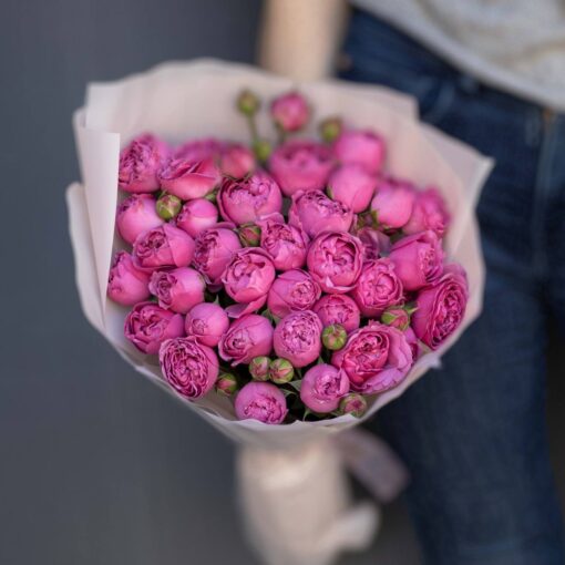 Bouquet of peony shrub roses in a stylish package. A complimentary flower card and a pack of cut flower food are included with each bouquet.