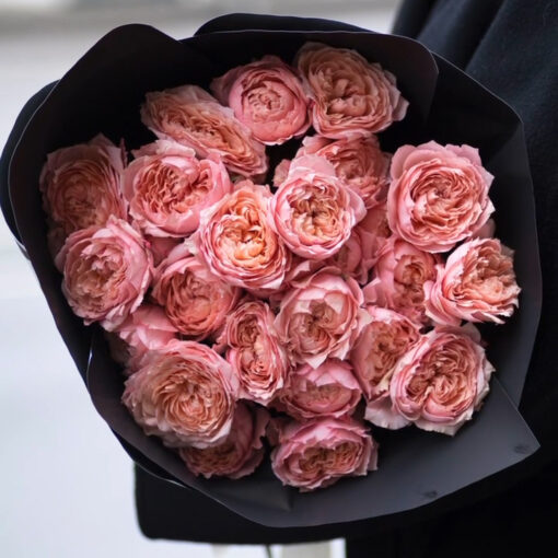 The magnificient bouquet of peony shrub roses in a stylish package. A complimentary flower card and a pack of cut flower food are included with each bouquet.