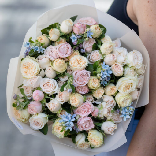Bouquet mix of peony shrub roses in a stylish package. A complimentary flower card and a pack of cut flower food are included with each bouquet. The recommended number of flower life extension sachets is 5 pieces.