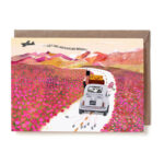 Design: a just-married car heading into adventure. Folding card printed in Amsterdam on premium recycled organic cotton paper. Includes a brown recycled envelope; packed in a recycled plastic bag. Blank inside. Size 10 × 15 cm.