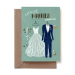 Design: a happy wedding couple. Folding card printed in Amsterdam on premium recycled organic cotton paper. Includes a brown recycled envelope; packed in a recycled plastic bag. Blank inside. Size 10 × 15 cm.