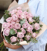 A bouquet of 15 spray peony roses with the addition of eucalyptus and ruscus in a stylish wrapping. We attach a card as a gift and a flower life extension product to each bouquet for free. The recommended number of sachets for extending the bouquet’s life is 5 pieces.