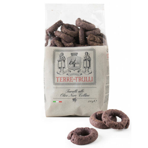 Classic Italian taralli made with flour, oil, and wine, enhanced with the rich flavor of black olives. Crispy and savory, they are a perfect snack to enjoy with red wine or beer.