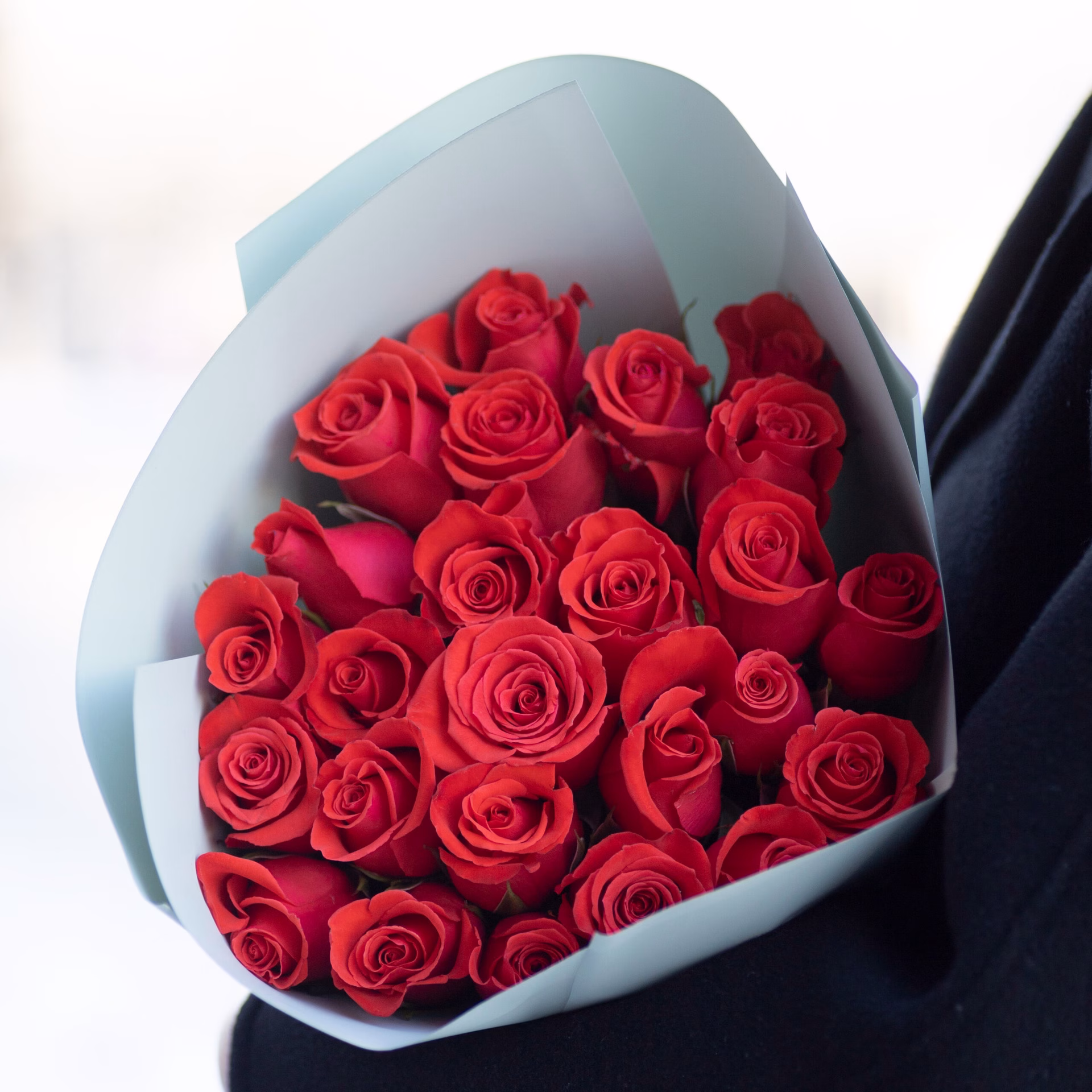 Kimp 25 roosi(Ecuador) stiilses pakendis. Igale meie kimpule lisame tasuta postkaardi ja lillede hooldus vahendi! Kimpide eluea pikendamiseks soovitatav kotikeste arv – 5 tk