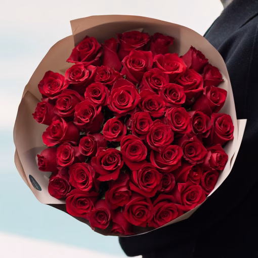 Chic bouquet of 51 roses, 35-50 cm tall, in a stylish wrap. A complimentary flower card and a pack of cut flower food are included with each bouquet.