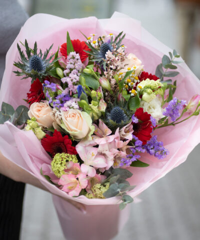 Kevadine kimp erinevaid lilli. Lillevarte arv 25 tk, värvigamma saab olla erinev. Foto näiteks – kogume saadaolevatest hooajalistest lilledest. Kommentaarides, tellimisel, palume täpsustada, millist kimpu soovite: erksa või õrna. Igatahes, kimp luuakse stiilne ja värsketest lilledest.