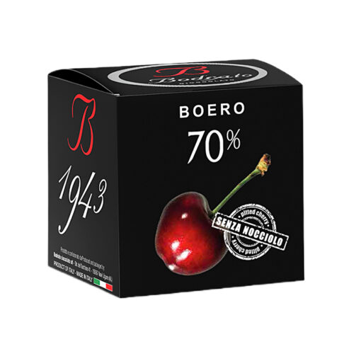 Tume šokolaad (kakao: min 70%) (kakaomass, suhkur, kakaovõi, emulgaator: SOJA letsitiin ja päevalilleseemned, Madagaskari Bourbon vaniljepulber). Täidis: kirsid ilma kivideta alkoholi ja grappa segus, suhkur, riisitärklis.