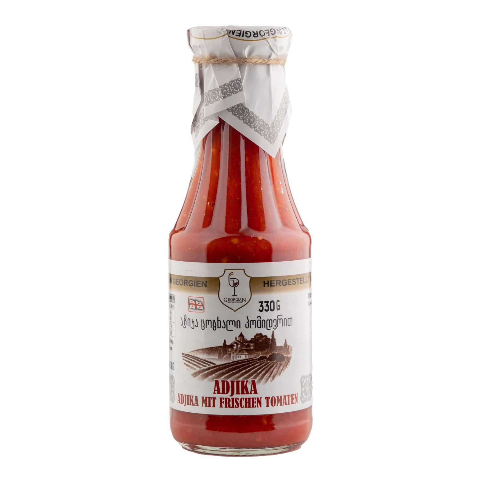 Elav Gruusia adjika tomatite, punase tšilli, küüslaugu ja aromaatsete ürtidega, sh sinine fenkol ja koriander. Sobib ideaalselt grillitud lihale: šašlõk, kebab, lambaliha ja kana.