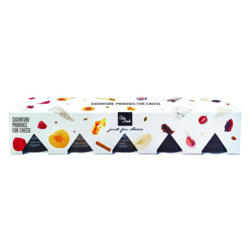 Viie 100% naturaalse magusa kastme komplekt, loodud ideaalselt sobima kõigi juustutüüpidega. Sisaldab kuldset õuna, vaarikaid, musti viigimarju, virsikuid ja aprikoose ning musta viinamarja