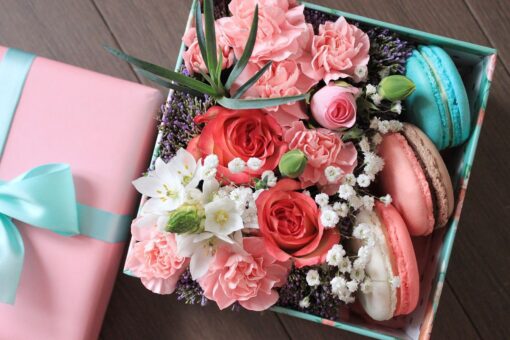 Õrn karp lillede ja maiustustega. Kinkige oma lähedastele rõõmu! Igale oma tööle lisame õnnitluskaardi kingituseks.