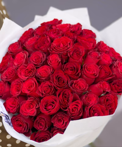 Chic bouquet of 101 red roses, 80 cm tall, in a stylish wrap. A complimentary flower card and a pack of cut flower food are included with each bouquet.