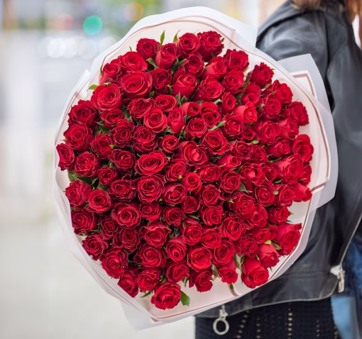 Šikk klassikaline kimp 101-st punast roosist(Keenia), kõrgus 60 cm. Igale kimbule lisame kinkekaardi ja rooside elu pikendamis hooldusvahendi. Kimpide eluea pikendamiseks soovitatav kotikeste arv – 7 tk