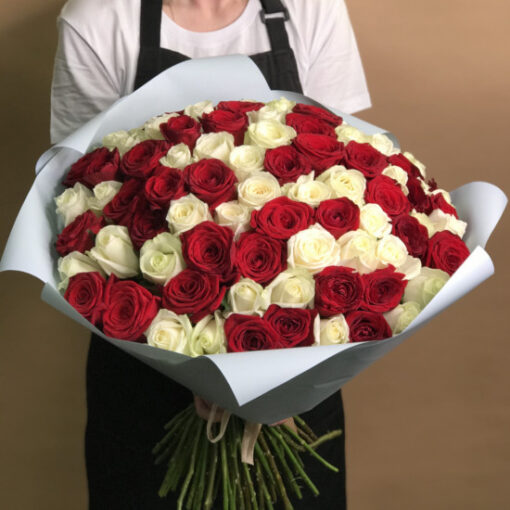 Chic bouquet of 101 red roses, 35-50 cm tall, in a stylish wrap(Kenya). A complimentary flower card and a pack of cut flower food are included with each bouquet.