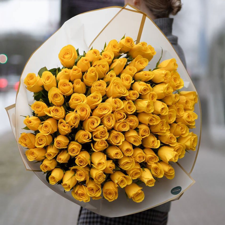 Šikk klassikaline kimp 101 roosi(kollane), kõrgus 80 cm. Igale kimbule lisame kinkekaardi ja rooside elu pikendamis hooldusvahendi. Kimpide eluea pikendamiseks soovitatav kotikeste arv – 5 tk