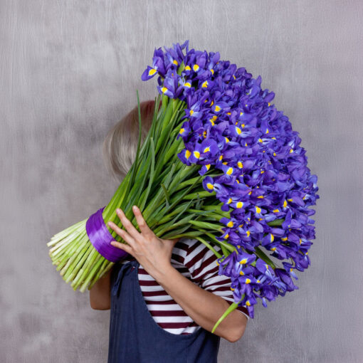 Imeline kimp 201 iirist, seotud paelaga. Iiriside avanemise aste võib olla erinev. Iga kimbu juurde lisame lillede hooldusvahendi ja kingituseks kaardi.