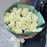 Klassikaline kimp 25 valgest roosist, kõrgus 40-50 cm. Igale kimbule lisame kinkekaardi ja rooside elu pikendamis hooldusvahendi. Kimpide eluea pikendamiseks soovitatav kotikeste arv – 3 tk