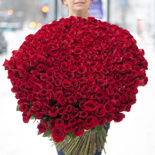 Chic bouquet of 301 red roses, 70 cm tall, in a stylish wrap. A complimentary flower card and a pack of cut flower food are included with each bouquet.