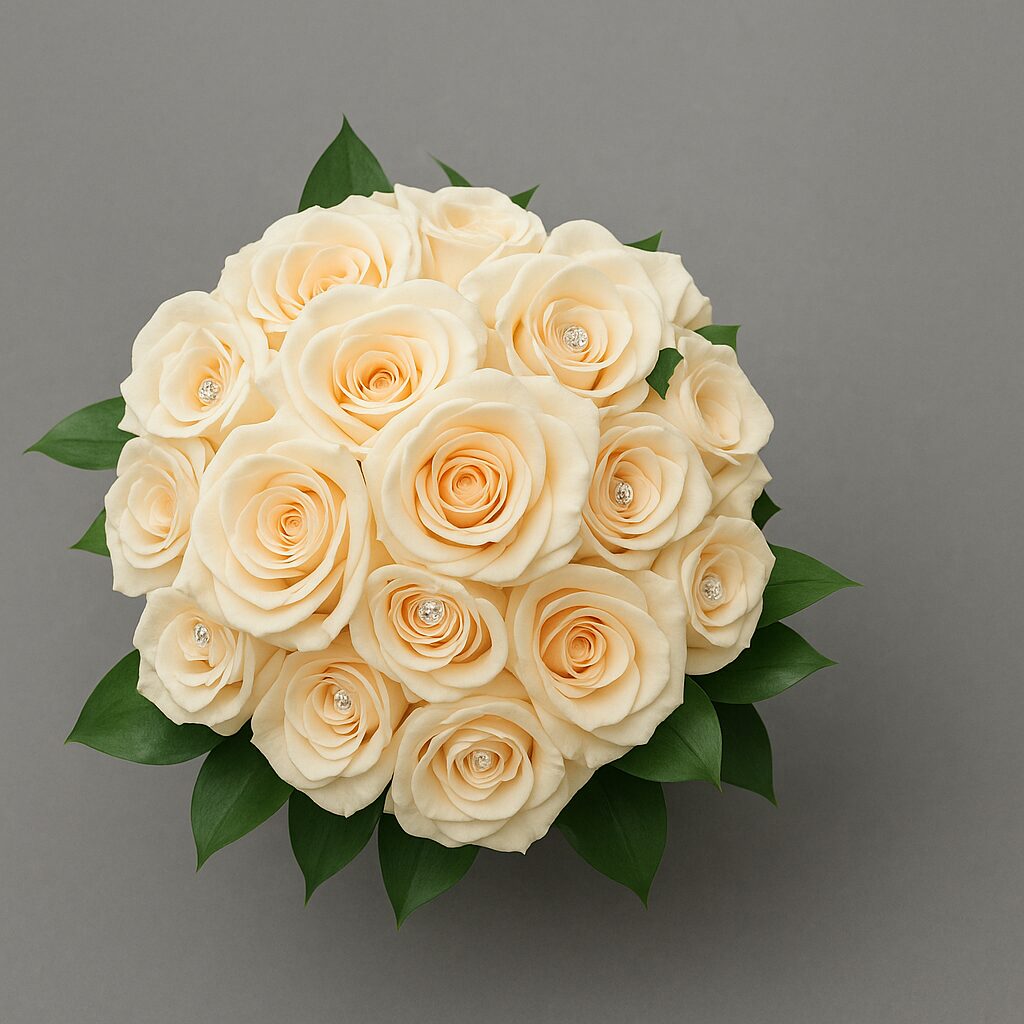 Klassikaline pruudikimp elevandiluuvärvi roosidest, – 19 tk. Satiinipaela värv – teie maitse järgi.