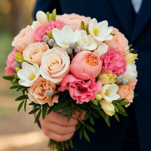Pruudikimp erinevate sortide roosidest, bruniatest, lisianthustest ja freesiatest.