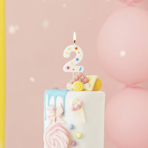 Sünnipäevaküünal number ‘2’, valge konfetti, 5,5 cm