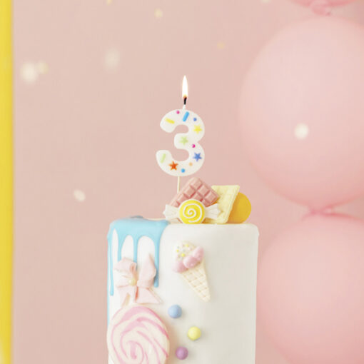 Sünnipäevaküünal number ‘3’, valge konfetti, 5,5 cm