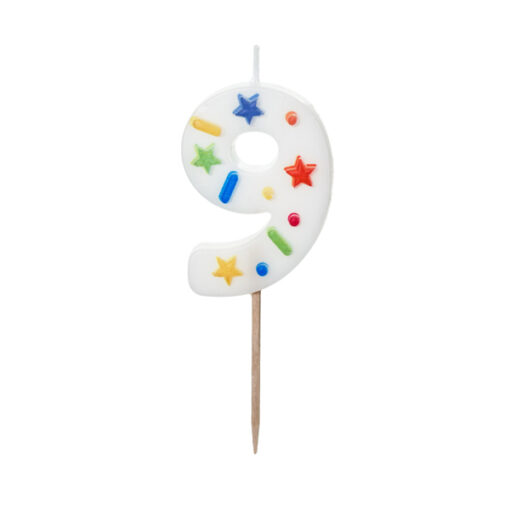 Sünnipäevaküünal number ‘9’, valge konfetti, 5,5 cm