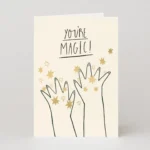 Kaardil on kujutatud kahte kätt, mis sirutuvad õhku ja saadavad kuldfooliumis sädelusi sõnumi poole “You’re Magic!”. Võluv kaart, mis sobib sünnipäevaks, õnnitlusteks, heade soovide või tänukaardina – sisekülg on tühi, et lisada oma sõnum.