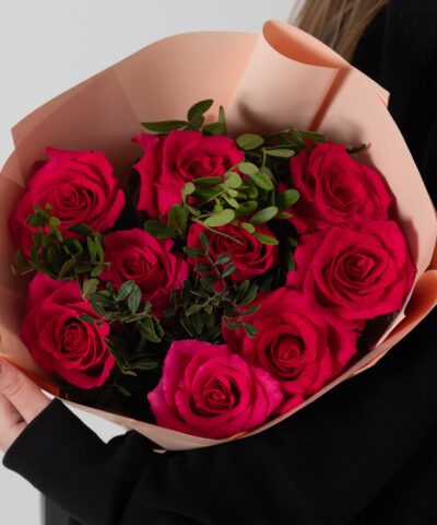 9 малиновых роз с зеленью (Эквадор)