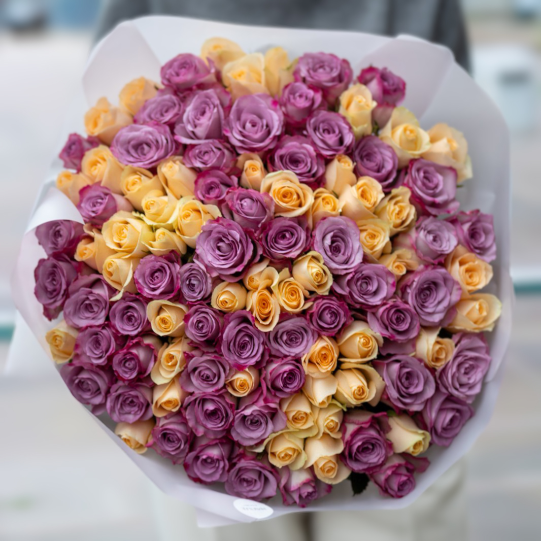Микс из роз создаёт эффект объёмного и яркого букета, подходящего для любого торжества: свадьбы, юбилея, признания в любви или просто особого момента.